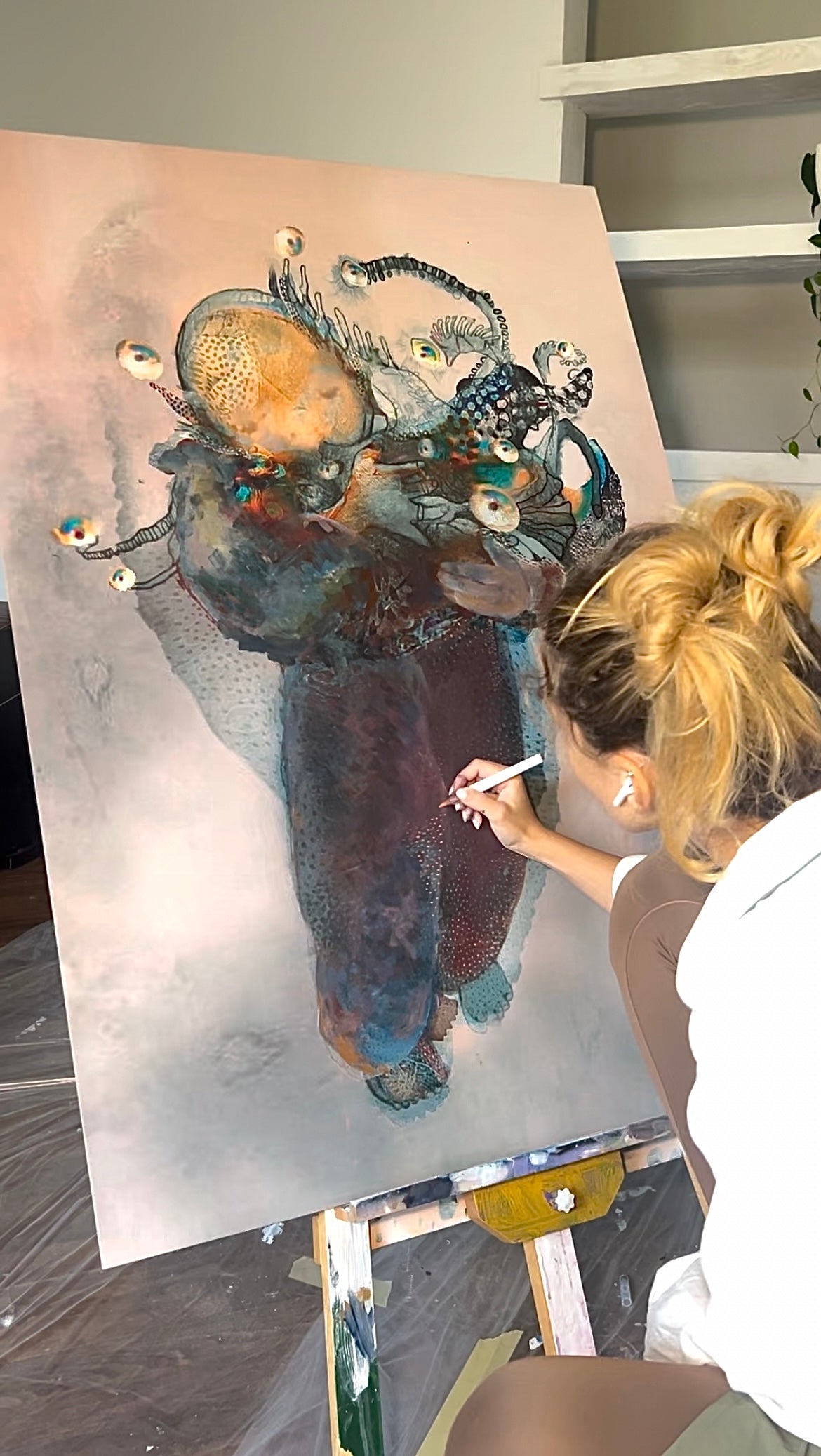 Handcrafted mixed-media artwork created with pencil and watercolor, later enhanced digitally. The piece is printed on wood and hand-finished with layers of acrylic and oil paint, giving it a unique texture.