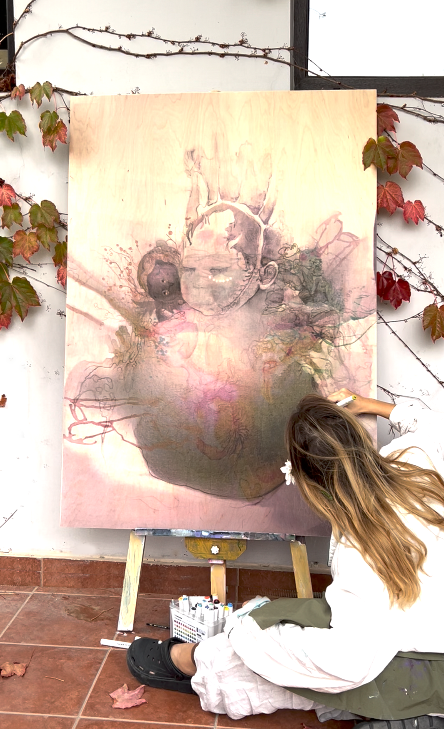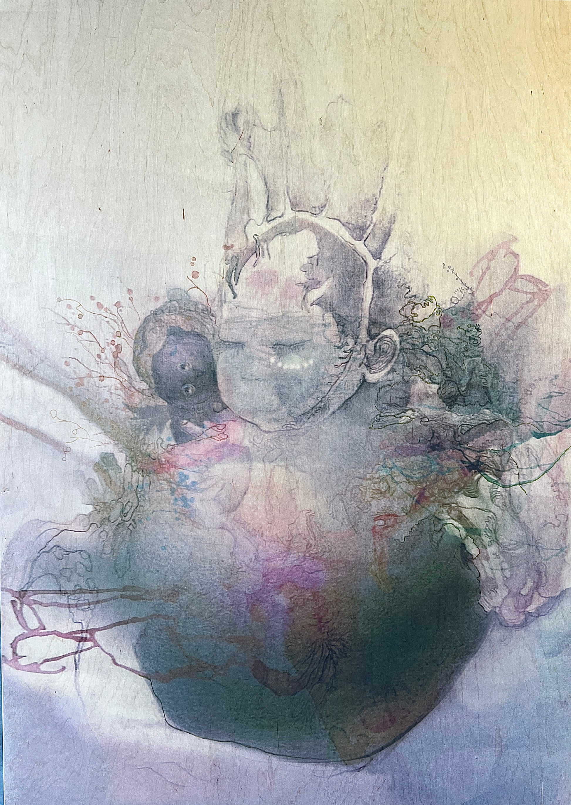 Handcrafted mixed-media artwork created with pencil and watercolor, later enhanced digitally. The piece is printed on wood and hand-finished with layers of acrylic and markers.